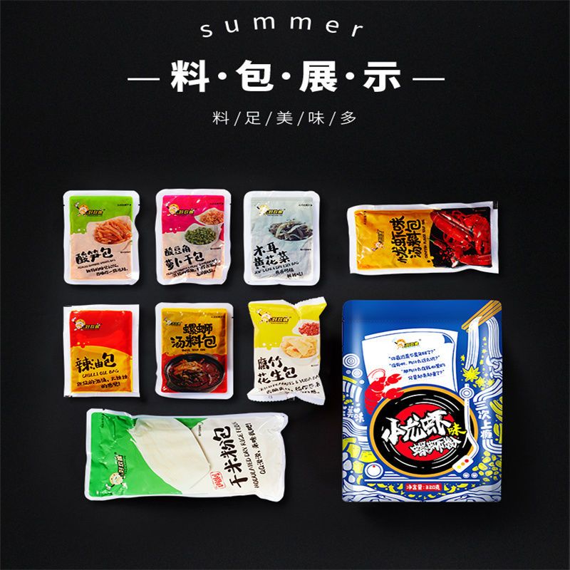 配料:調制干米粉包、螺螄湯配料包、辣椒油配料包、酸筍配料包、腐竹配料包、花生配料包、香醋包、酸豆角黑木耳蘿卜干配料包